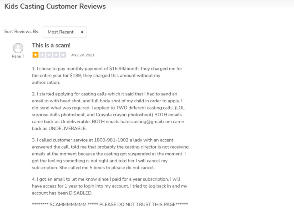 A year ago, Rene T who seems furious about Kids Casting claimed that after paying for a monthly subscription, they went ahead and changed it to annual, forcing her to pay $199. She applied for two casting calls using the email (halescasting at Gmail do com) she was given but the application didn’t go through. Instead, the emails came back as undeliverable.